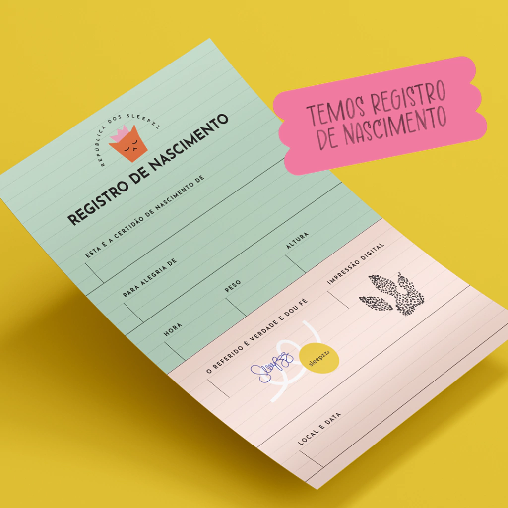 Cada Sleepzz vai até você com Certidão de Nascimento, para ser preenchida quando chegar ao seu destino. Para ajudar nessa experiência, enviamos também uma fita métrica para medir e saber o peso do seu amigo Sleepzz.